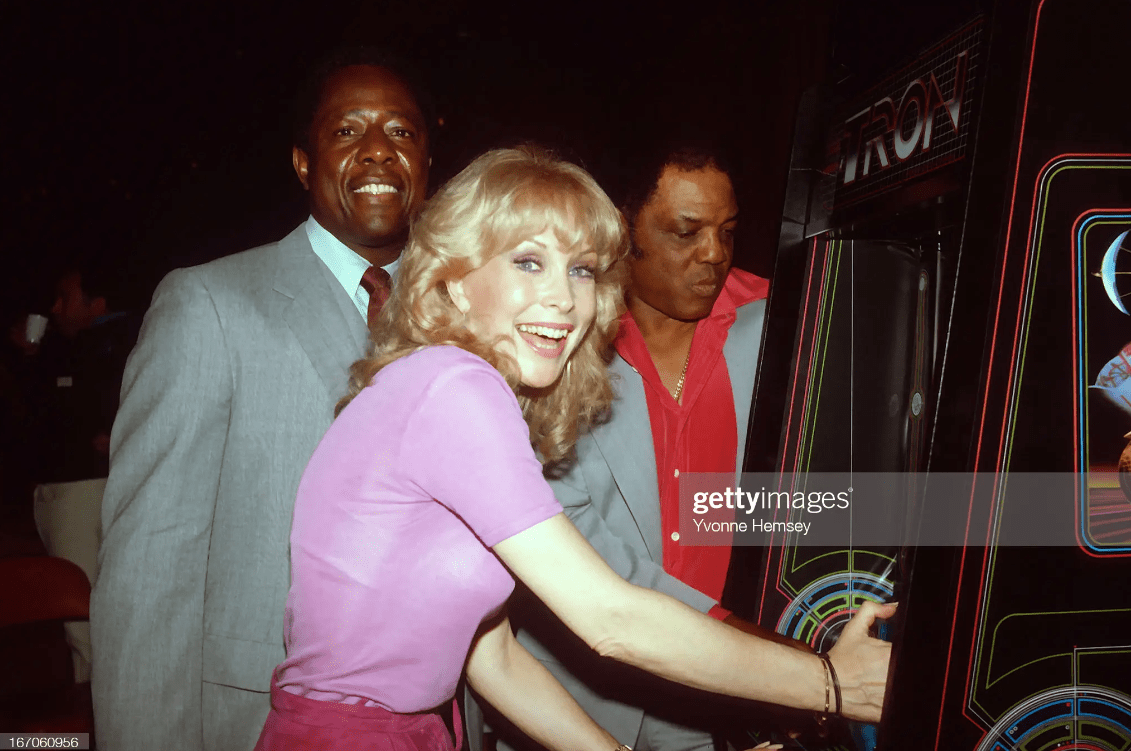 Willie Mays, Barbara Eden, and Hank Aaron on Sutton promote the release of the Tron video game in New York because it was the ’80s.